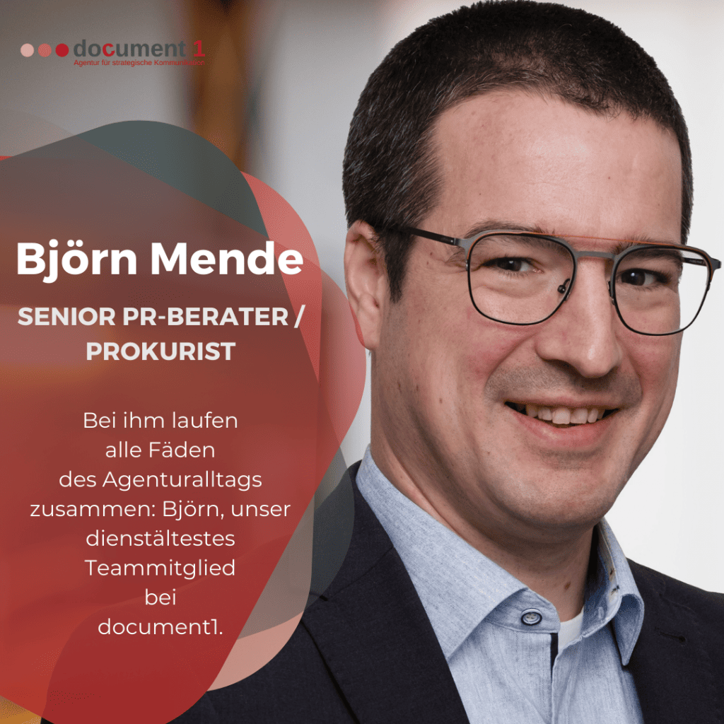 Heute möchten wir Euch unseren Senior PR-Berater und Prokuristen Björn vorstellen: Ob Angebote oder Arbeitsplanungen, Konzepte oder Korrekturen, Fortbildungsanträge oder Finanzfragen – vieles geht über seinen Schreibtisch. Mit inzwischen zwölf Jahren bei document1 ist Björn unser dienstältestes Teammitglied.